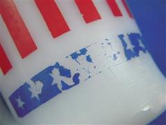 アメリカ国旗をモチーフとした非常にレア度の高いマグなのですが、残念ながらプリント部に色の剥がれがあります。内面的にも綺麗で、他リムの汚れ以外際立ったダメージはありません。コレクターズアイテムのひとつです。