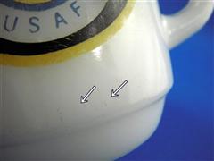 空軍の消防のマグでしょうか。プリントは艶がなく、ロスもあります。側面に劣化線、リムに黒点、着色が見られますが内面の艶は良いです。なかなかインパクトのあるマグですね。