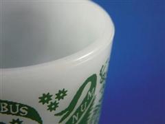 鷲をモチーフとした絵柄です。口元に製造時にできたバリから来るがさつきが若干とプリントインクの飛びがわずかにあります。内面もとても綺麗で使用感のないマグです。