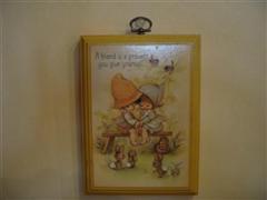 可愛らしい子供が描かれたふわっとした暖かい感じのする木製の壁掛けです。